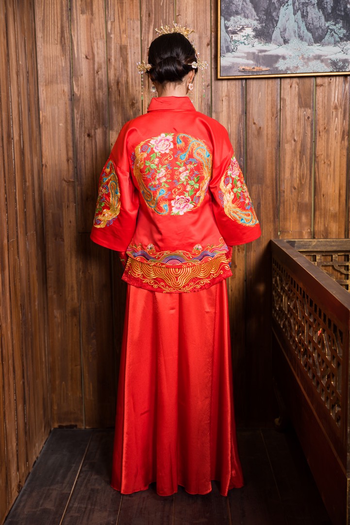 中式女性婚服的鳳冠霞帔、襖裙、龍鳳褂裙等,從1950年代起龍鳳褂裙從寬大轉為合身,裙亦由馬面裙改為筒裙,1970年代起更改為西式立體剪裁,且有收腰的設計,1980年代起龍鳳褂亦由鈕扣繫結轉為用拉鏈,每個年代都會加入當代流行的元素做小改款。